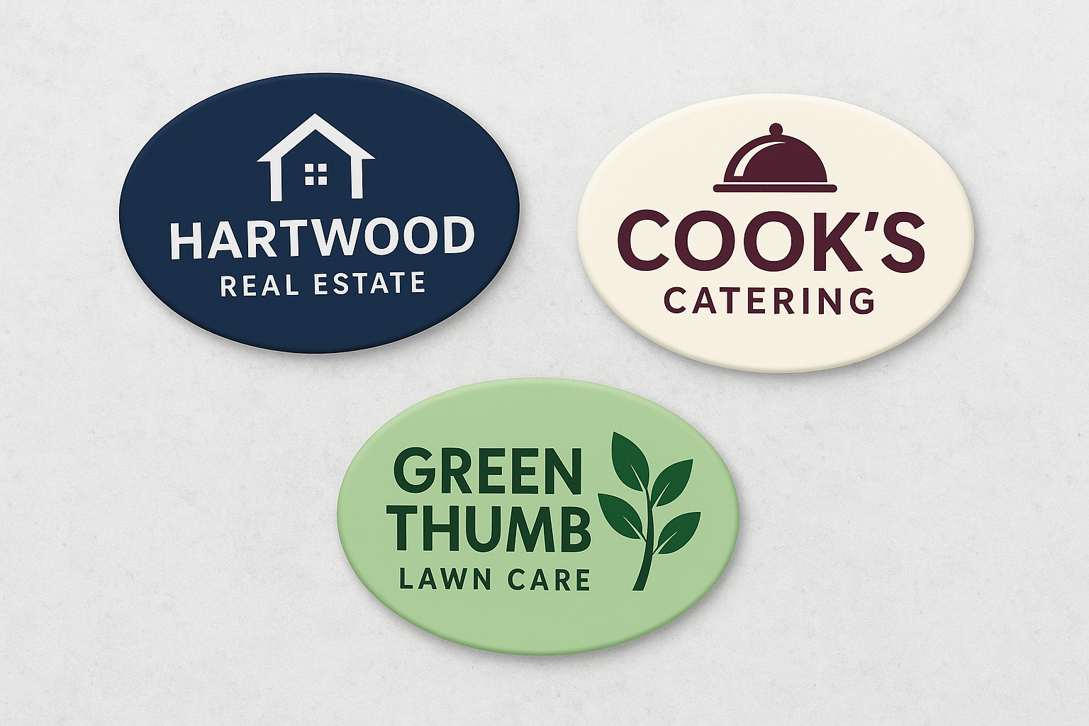 Oval magnets are available in various sizes and both indoor and outdoor safe models. With oval shaped car magnets, you can get across your message to countless people across your city. Magnets are easy to stick, take off or reposition anytime unlike a permanent decal. This simplicity of application makes it a perfect choice for small businesses, delivery services, and contractors who’d rather not have their car covered in decals 24/7. With each mile you drive, it’s free exposure for your brand.